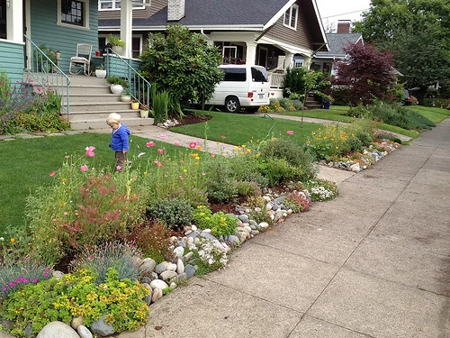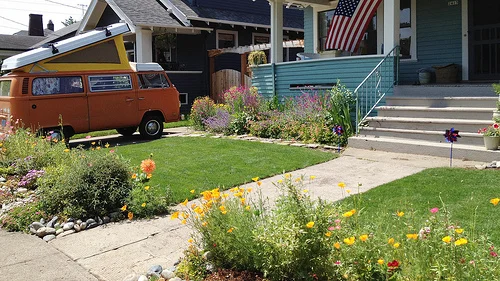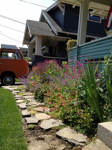 We lined the front of the yard with rocks and a ton of plant stepables that have grown and spread nicely over the last many months. John sprinkled wild flower seeds on the backside of the rocks and OMGoodness, what a delight it is to have a wildflower garden along the sidewalk! Poppies, dahlias, the works. We put more stepping stones/pathway from our porch to the driveway plus a fence and we’re calling it done.