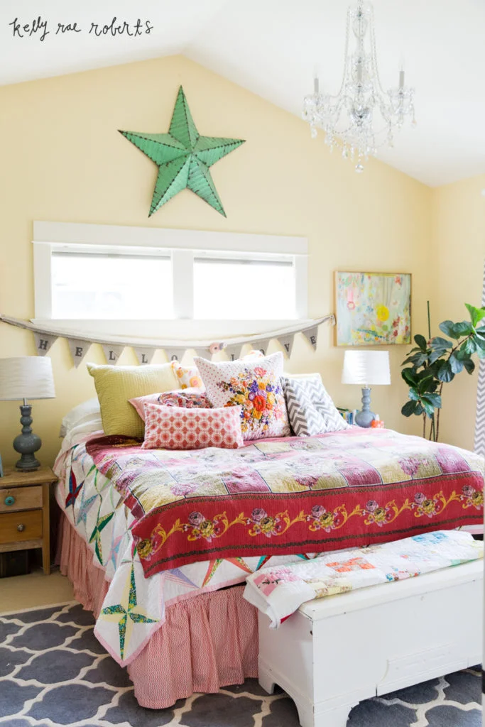 This room has large ceilings that form a peak – love that! The big metal star has never been happier than in this space. Our bedspread is a patchwork of vintage sari’s. We found it in a shop in HI years ago and we fell in love instantly.